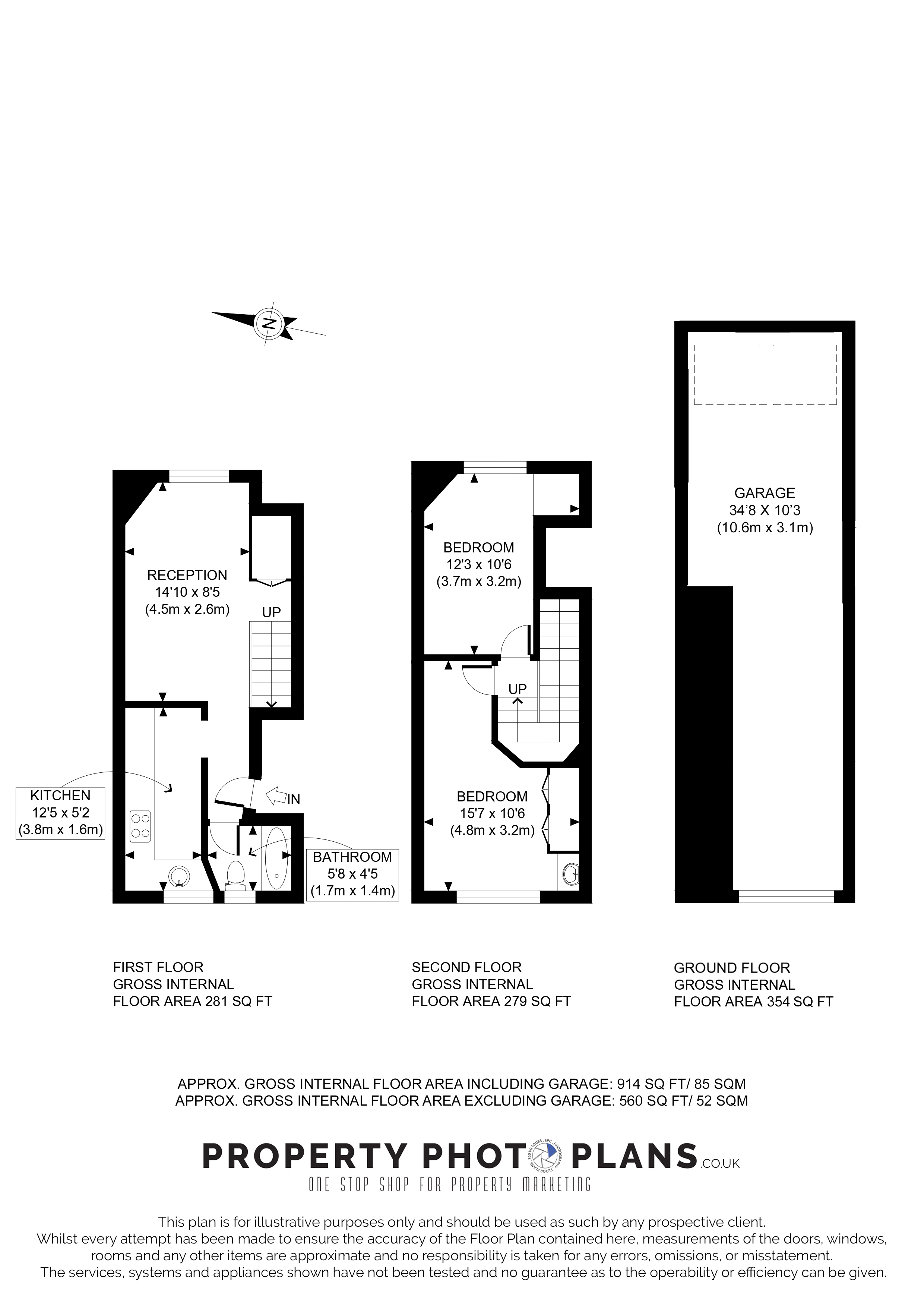 The property is in need of refurbishment and currently comprises a garage on the ground floor, with two bedrooms, a reception room, and a bathroom arranged over the first and second floors.